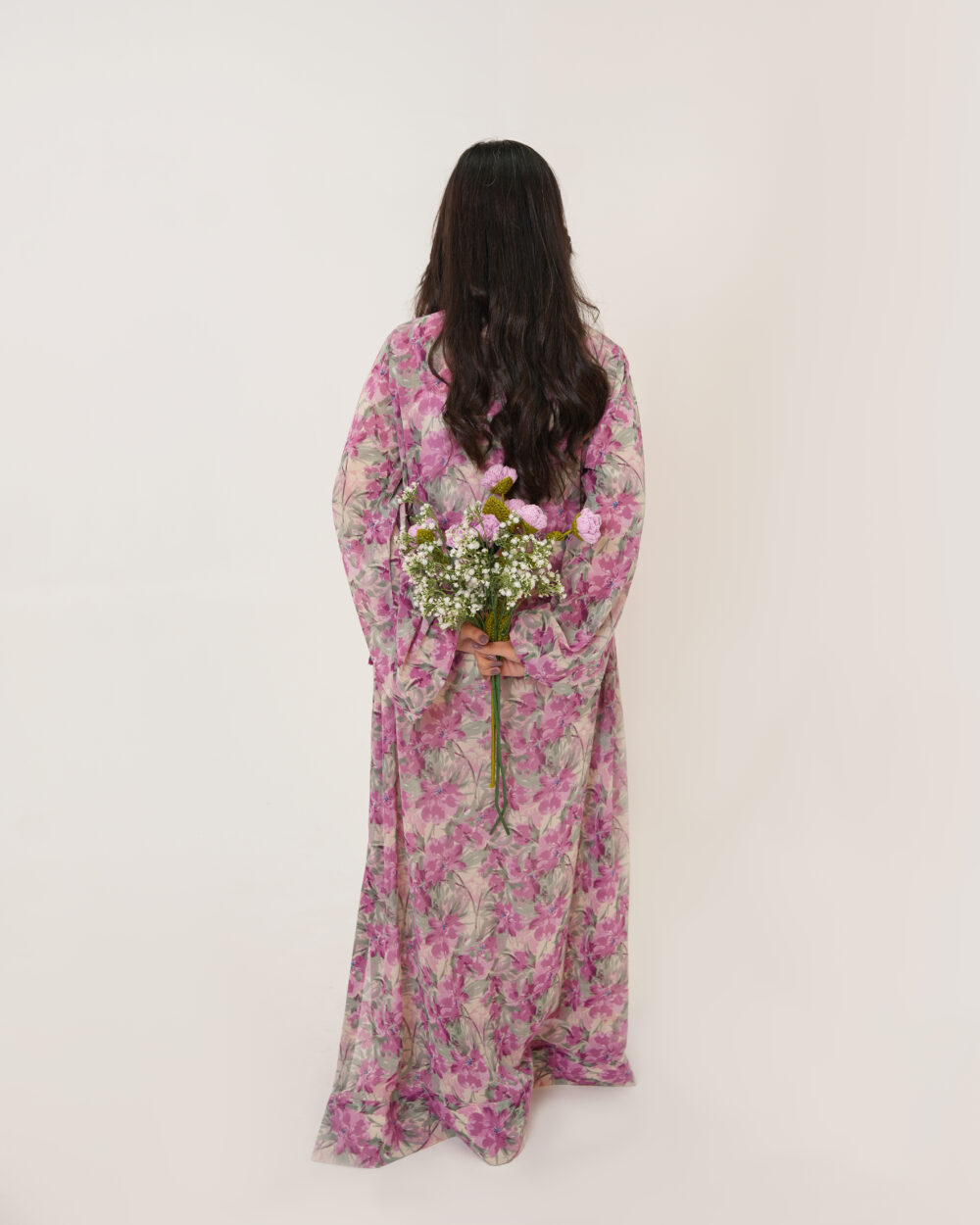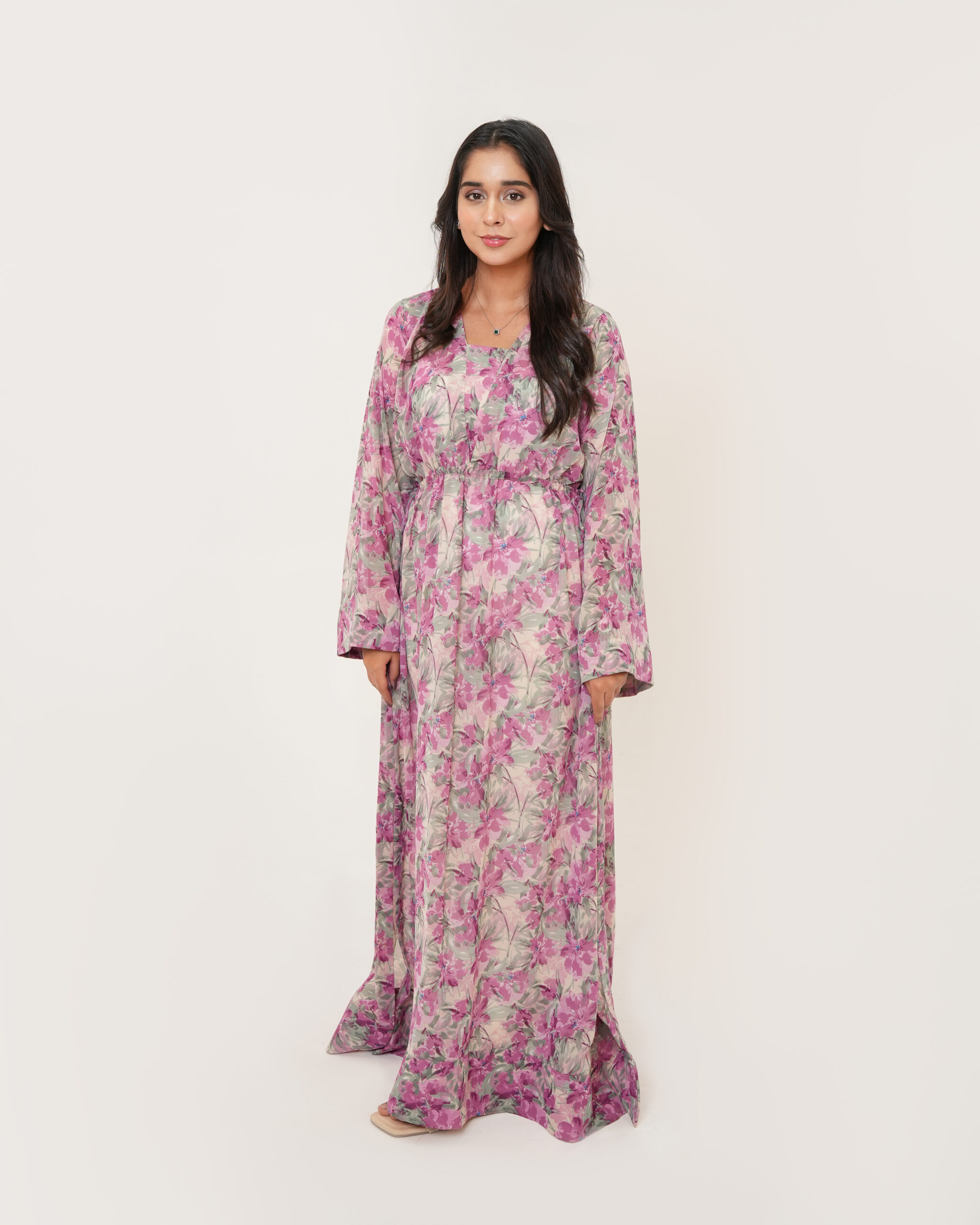 Product Detail: A graceful pink floral chiffon maxi dress designed with flared sleeves and an elongated V-neckline. The relaxed silhouette is elevated with waistline tassels, adding movement and charm.
